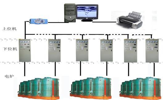 該系統采用上、下位機兩級控制,一臺上位機帶6臺下位機(即電爐控制柜)。上位機集中監控管理,下位機分別控制每臺電爐,組成集散式(DCS)控制系統。